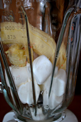 In a blender, combine 8 large marshmallows and 1 banana. The marshmallows give an extra sweet flavor and they make the banana cream super smooth.